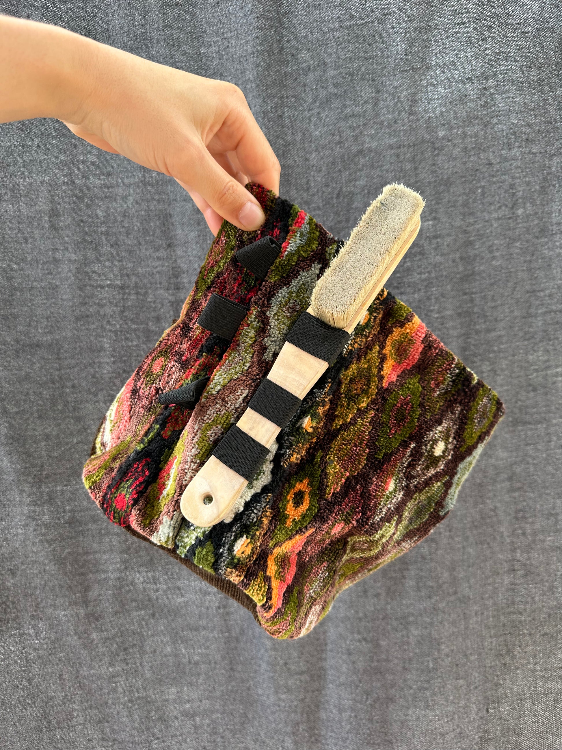 Phone or tape pocket, elastic brush holds, fleece lining and drawstring closure.