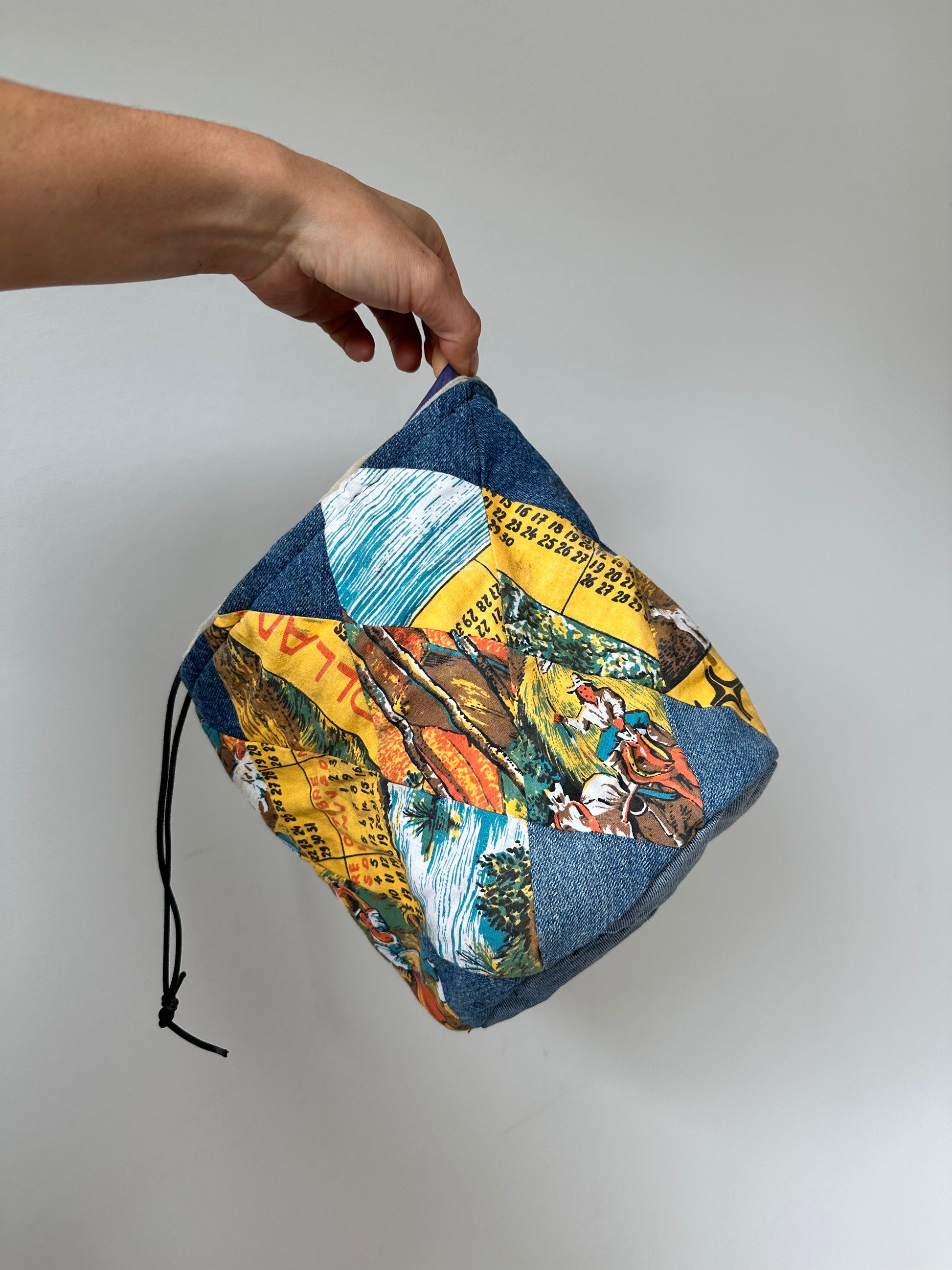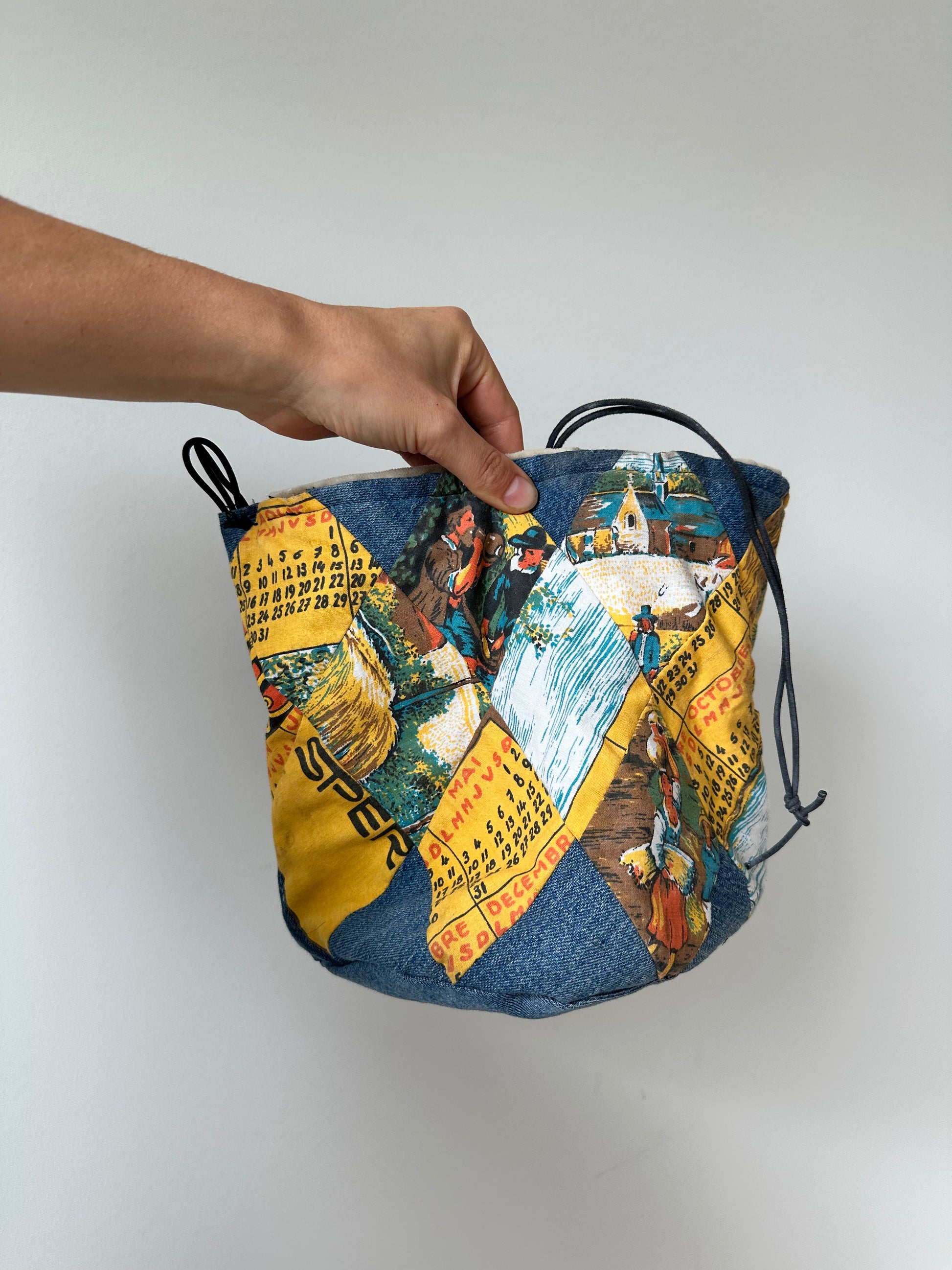 This was the first bucket I ever made! Crafted from a tea towel I was given in France and an old pair of jeans.